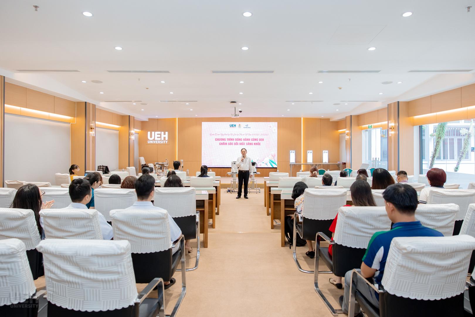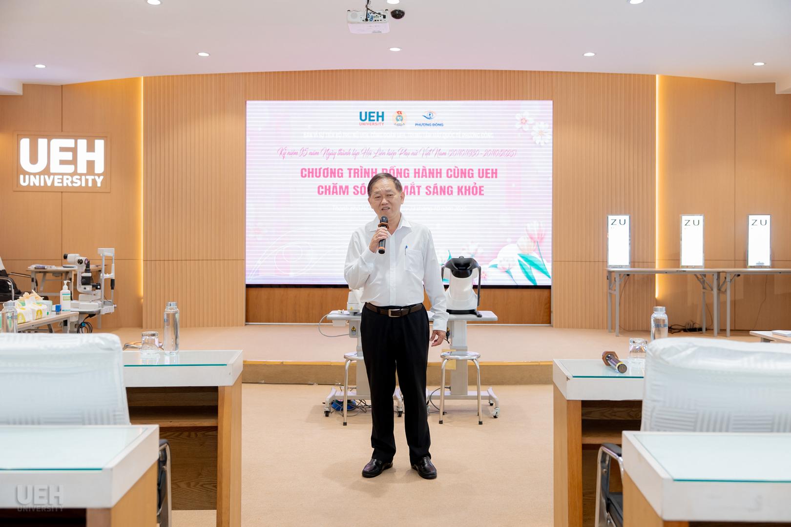 Phát biểu khai mạc chương trình, TS. Nguyễn Thiện Duy – Chủ tịch Công đoàn UEH, Phó Trưởng ban Vì sự tiến bộ phụ nữ UEH đã gửi lời chúc mừng ý nghĩa đến toàn thể nữ viên chức, người lao động nhà trường. TS. Nguyễn Thiện Duy nhấn mạnh tầm quan trọng của sức khỏe đôi mắt đối với chất lượng công việc và cuộc sống, đồng thời bày tỏ sự vui mừng khi chương trình nhận được sự hưởng ứng tích cực từ toàn thể đoàn viên công đoàn, viên chức, người lao động và gia đình; người học UEH đến tham dự.
