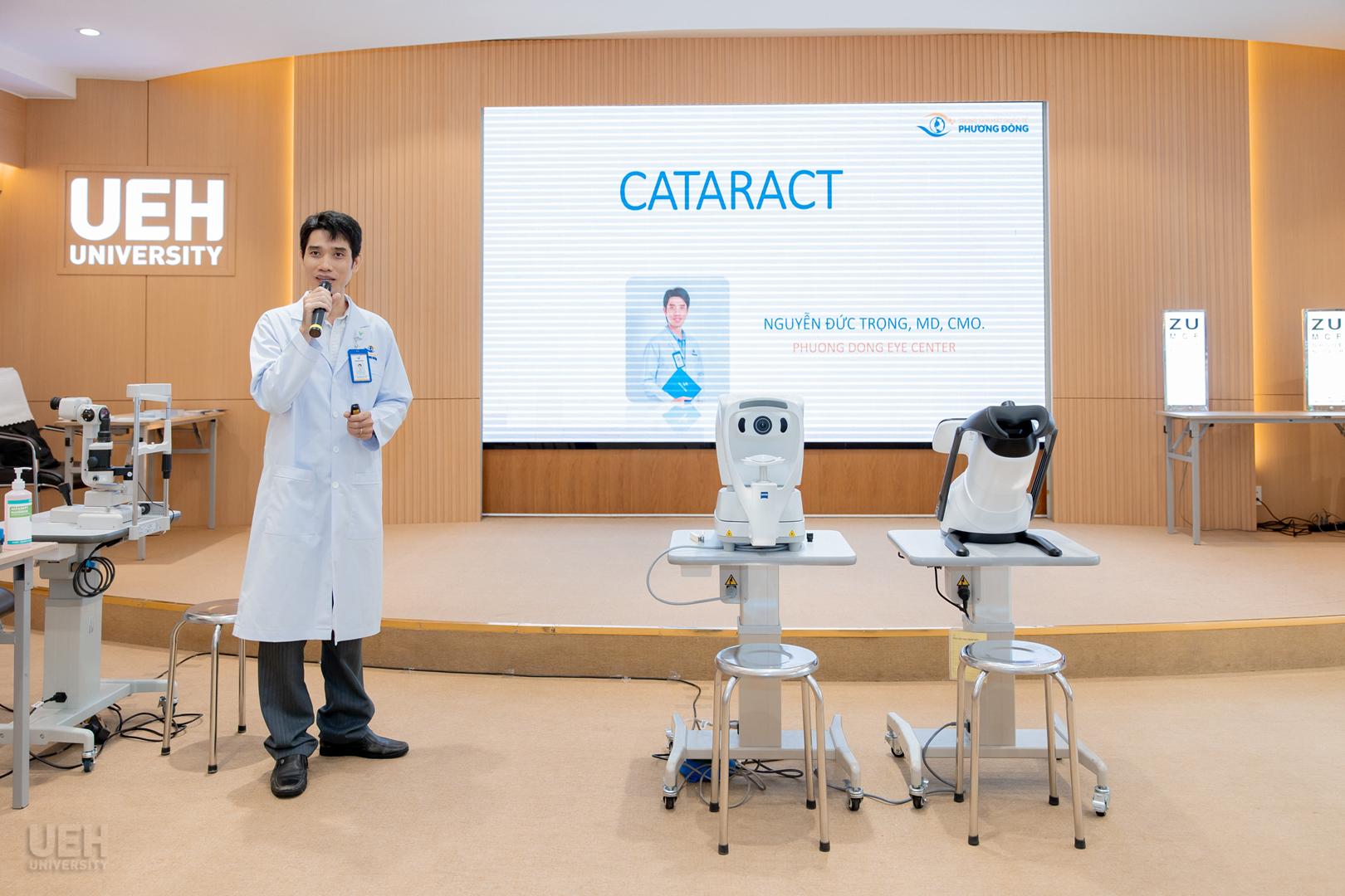 Một trong những nội dung nổi bật của chương trình là phần báo cáo chuyên đề “Bệnh lý Đục thủy tinh thể” do Bác sĩ Chuyên khoa I Nguyễn Đức Trọng – Giám đốc Chuyên môn Trung tâm Mắt Quốc tế Phương Đông trình bày. Bằng kiến thức chuyên môn sâu và cách truyền đạt dễ hiểu, Bác sĩ Trọng đã mang đến cho người tham dự những thông tin hết sức giá trị về nguyên nhân, dấu hiệu nhận biết và các phương pháp điều trị, phòng ngừa căn bệnh này.
