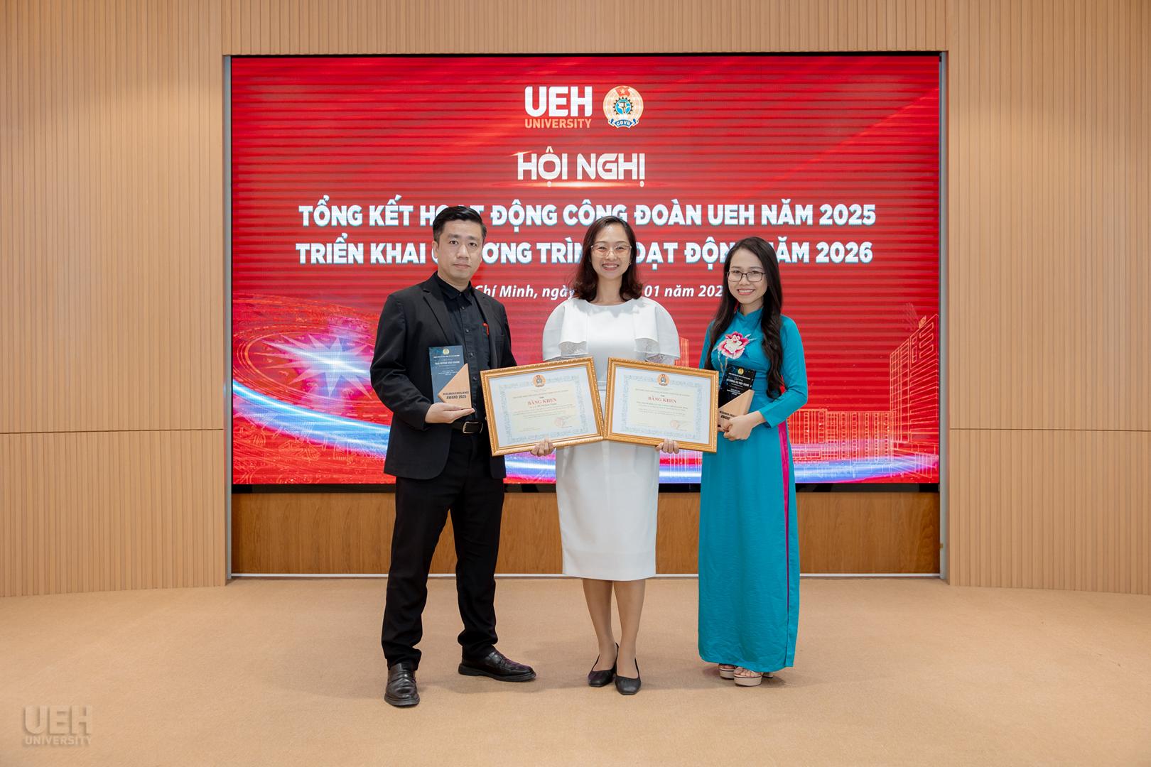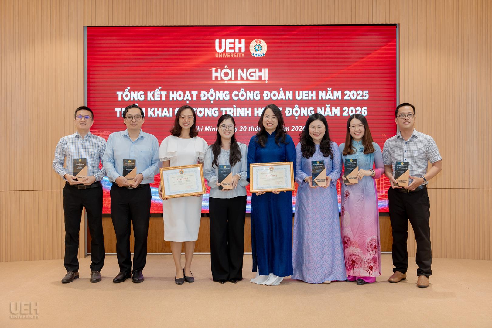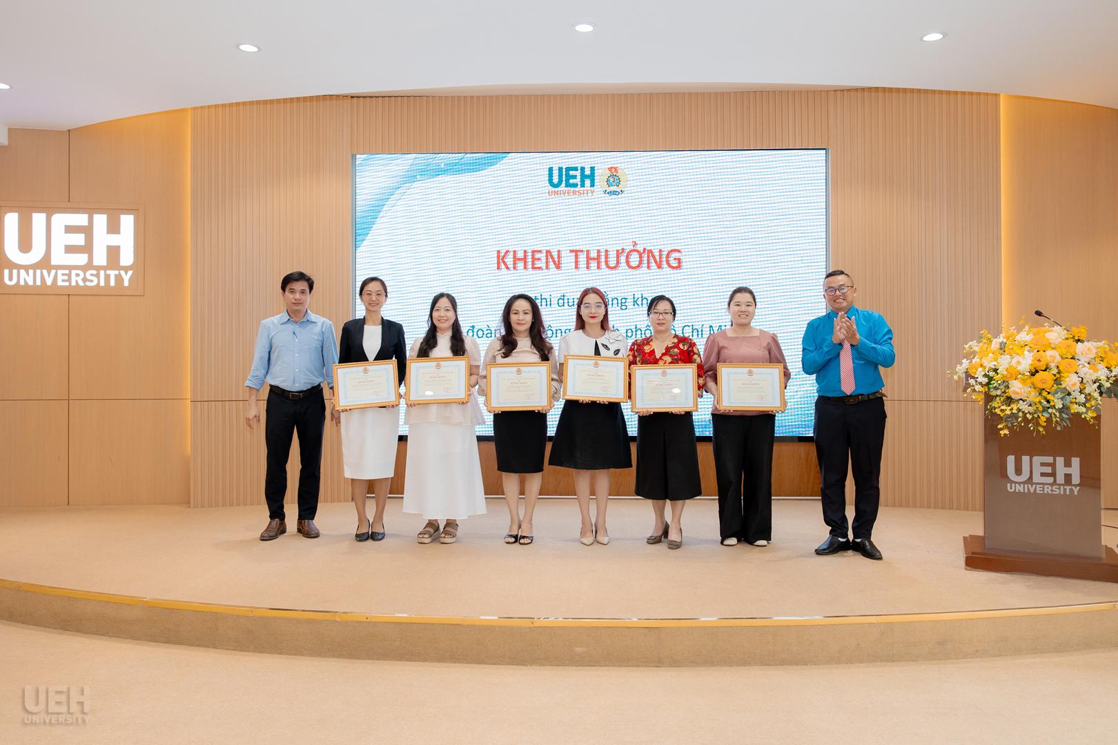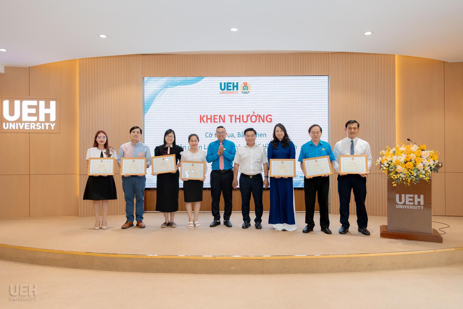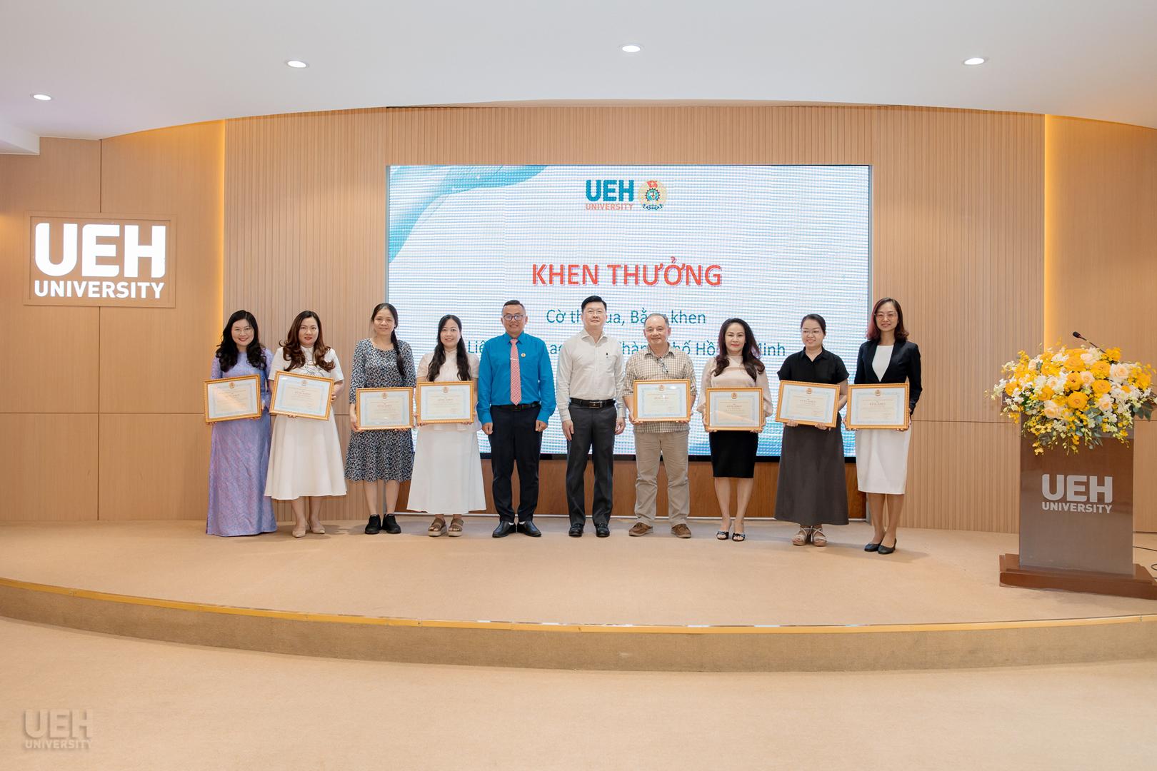 – Khen thưởng của Liên đoàn Lao động Thành phố năm học 2024 – 2025: Công đoàn UEH nhận Cờ thi đua Hoàn thành xuất sắc nhiệm vụ; 06 tập thể và 19 cá nhân tiêu biểu nhận Bằng khen đạt thành tích xuất sắc trong phong trào thi đua lao động giỏi và xây dựng tổ chức Công đoàn vững mạnh.