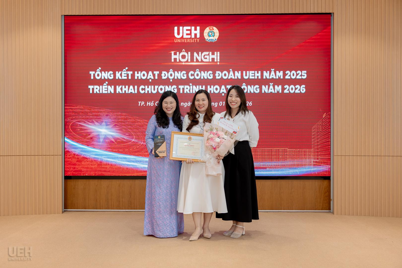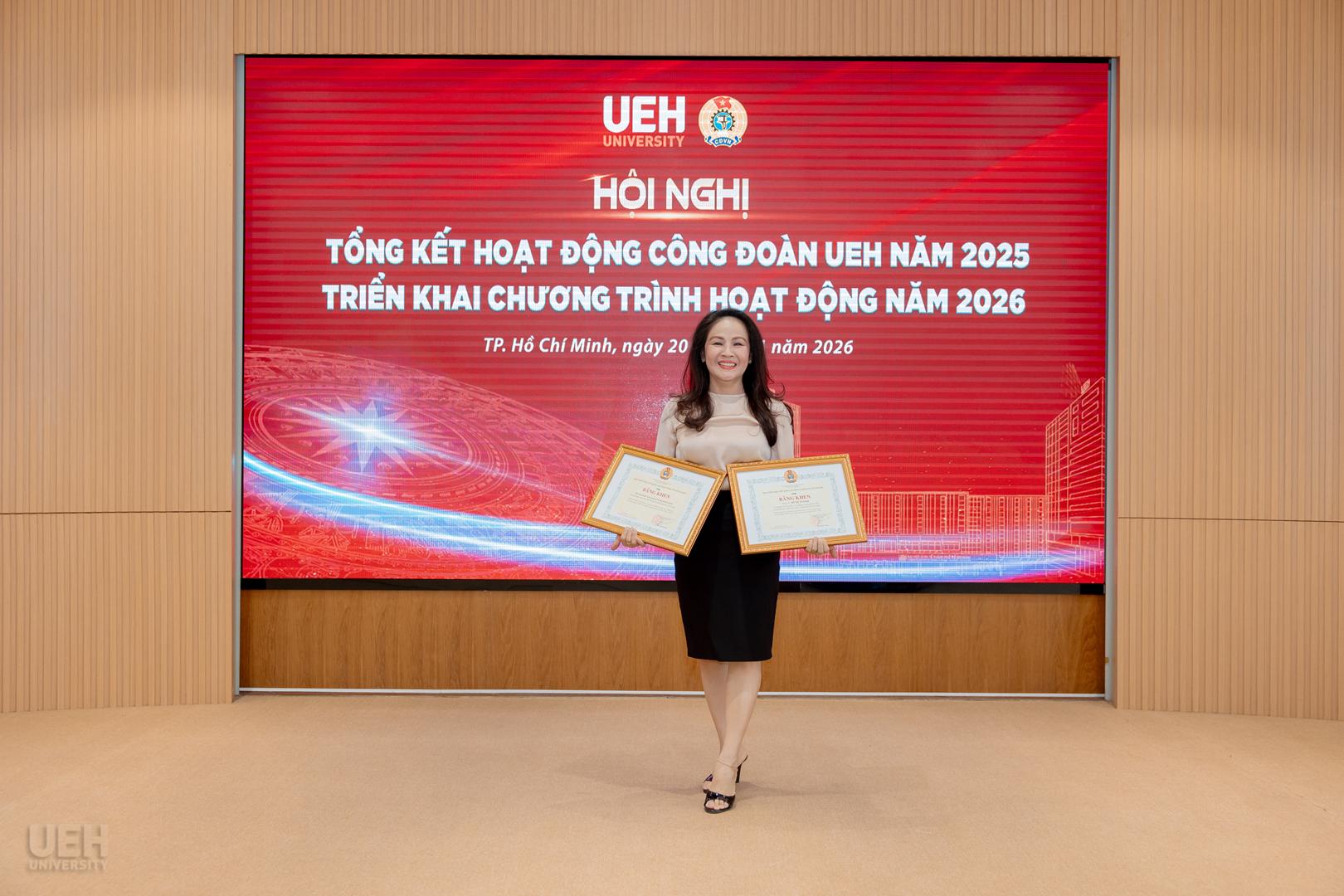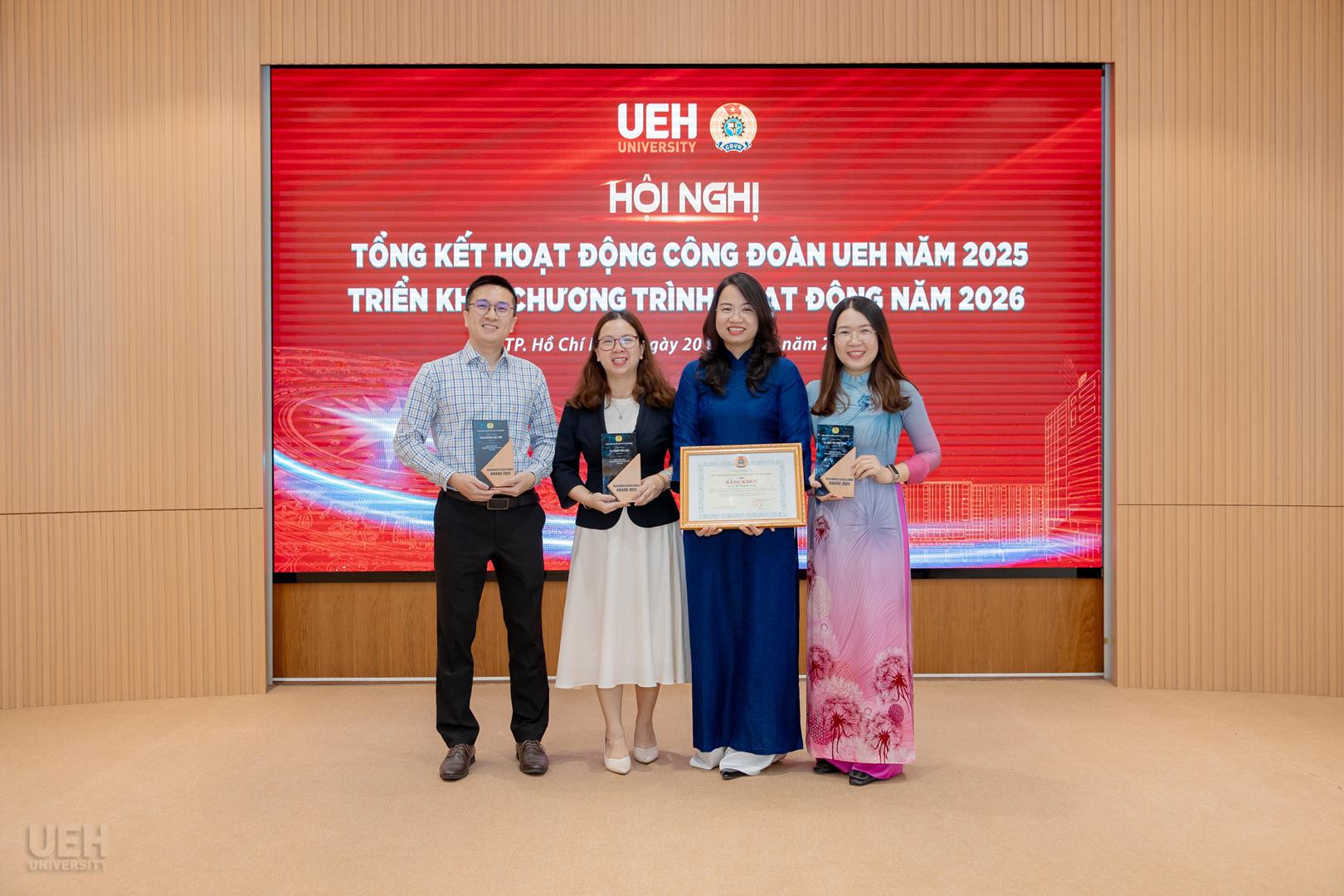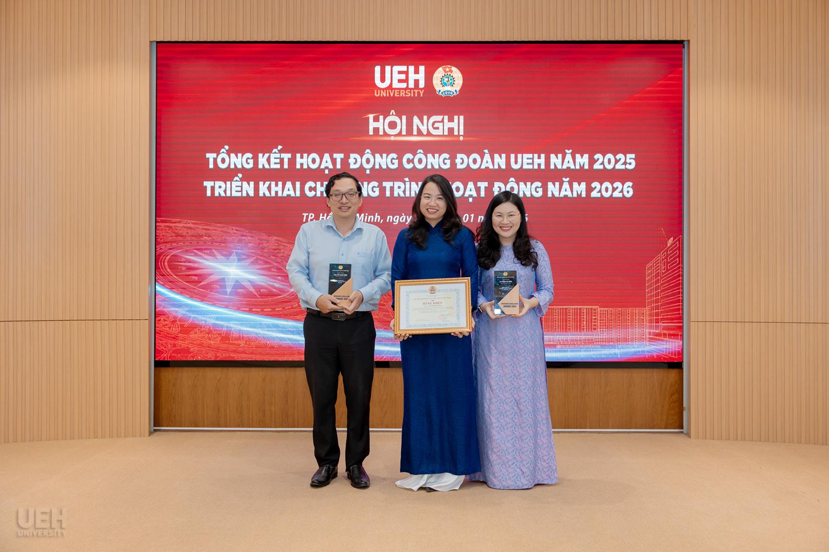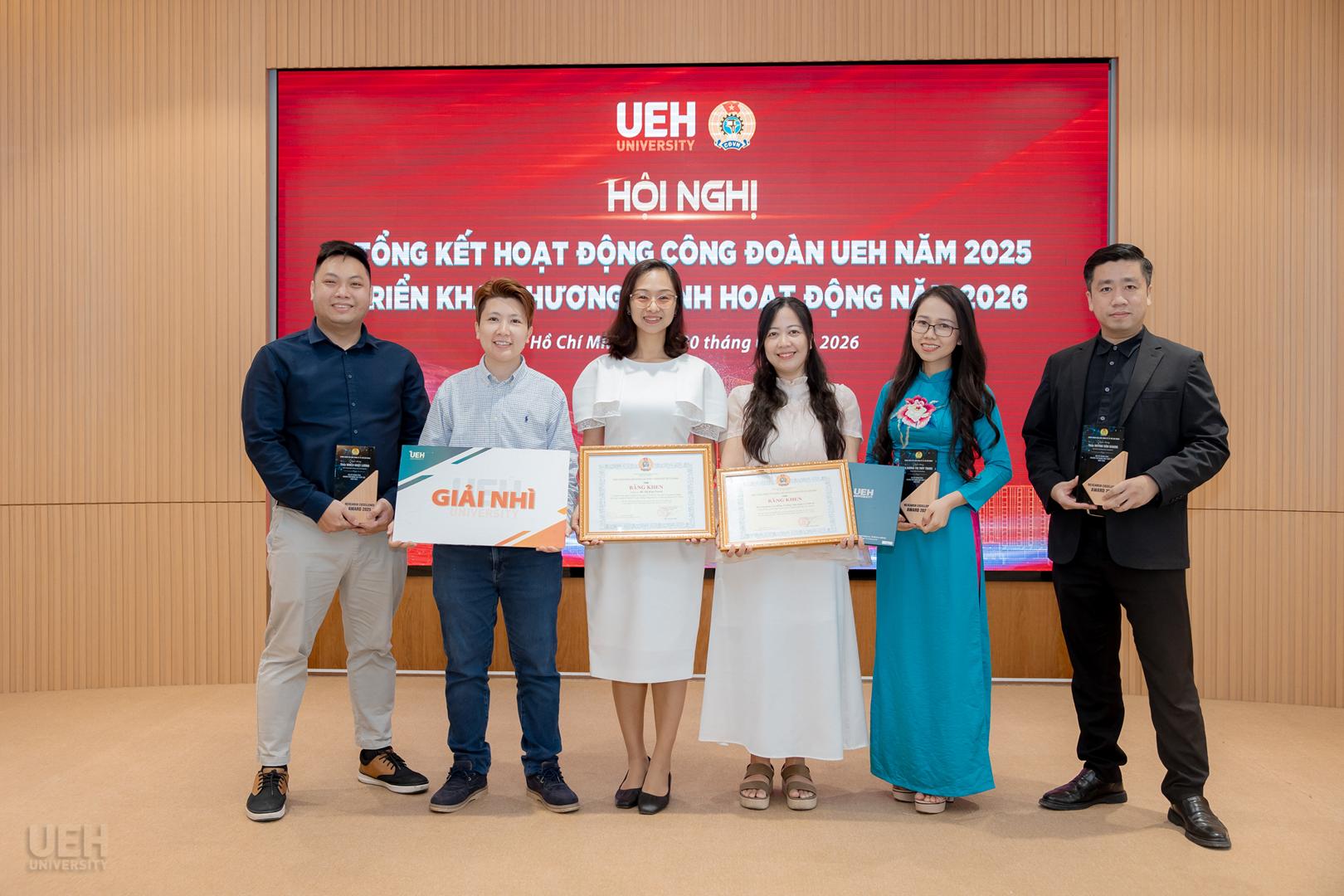 – Khen thưởng của Liên đoàn Lao động Thành phố năm học 2024 – 2025: Công đoàn UEH nhận Cờ thi đua Hoàn thành xuất sắc nhiệm vụ; 06 tập thể và 19 cá nhân tiêu biểu nhận Bằng khen đạt thành tích xuất sắc trong phong trào thi đua lao động giỏi và xây dựng tổ chức Công đoàn vững mạnh.