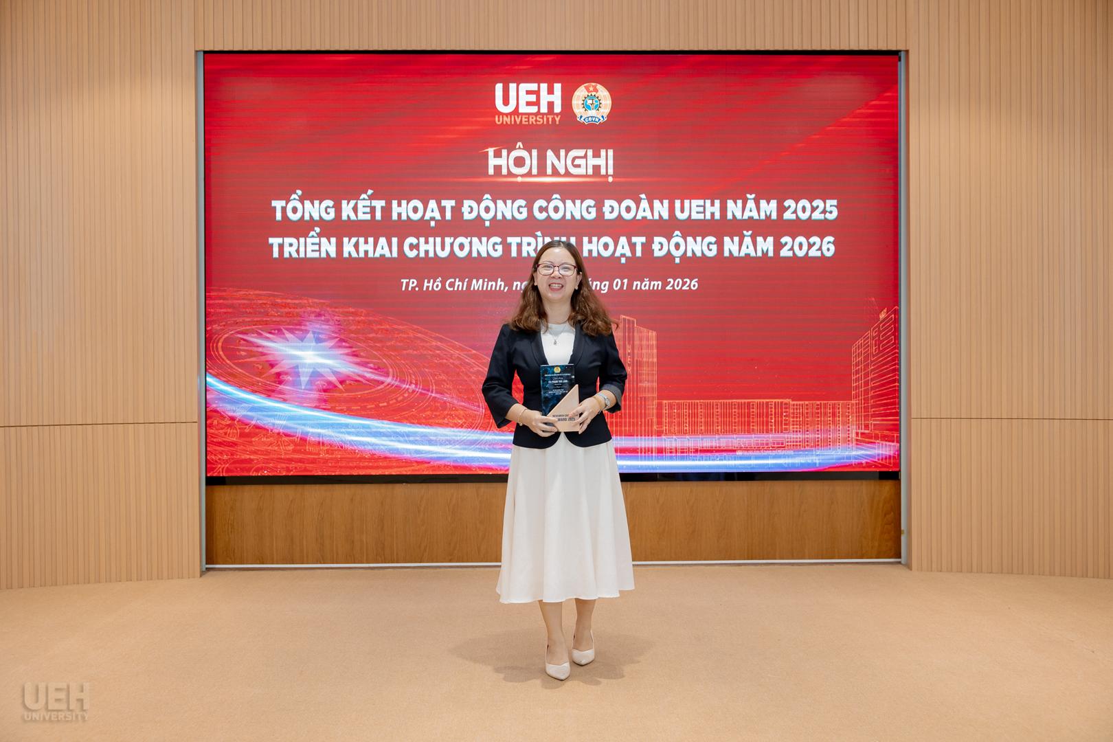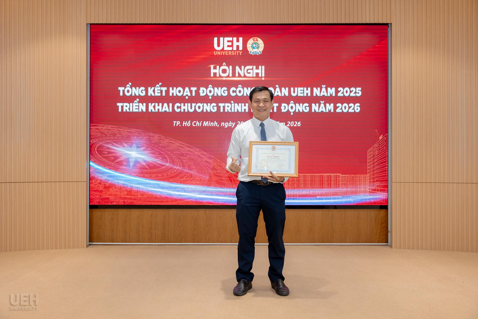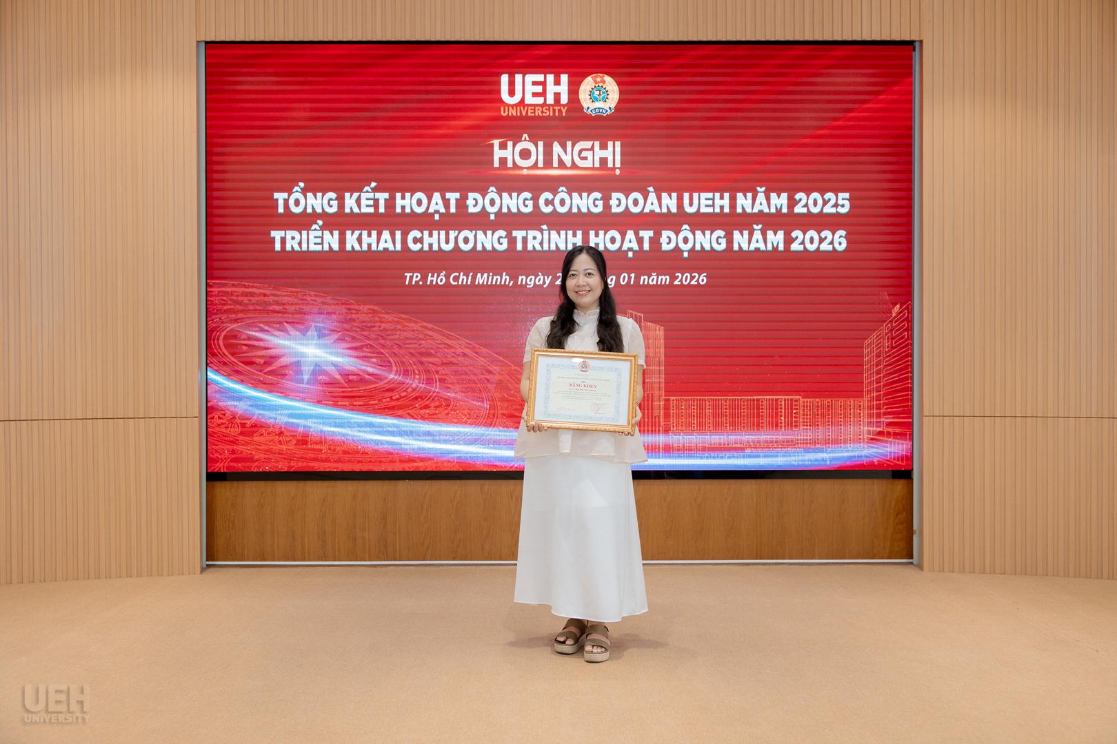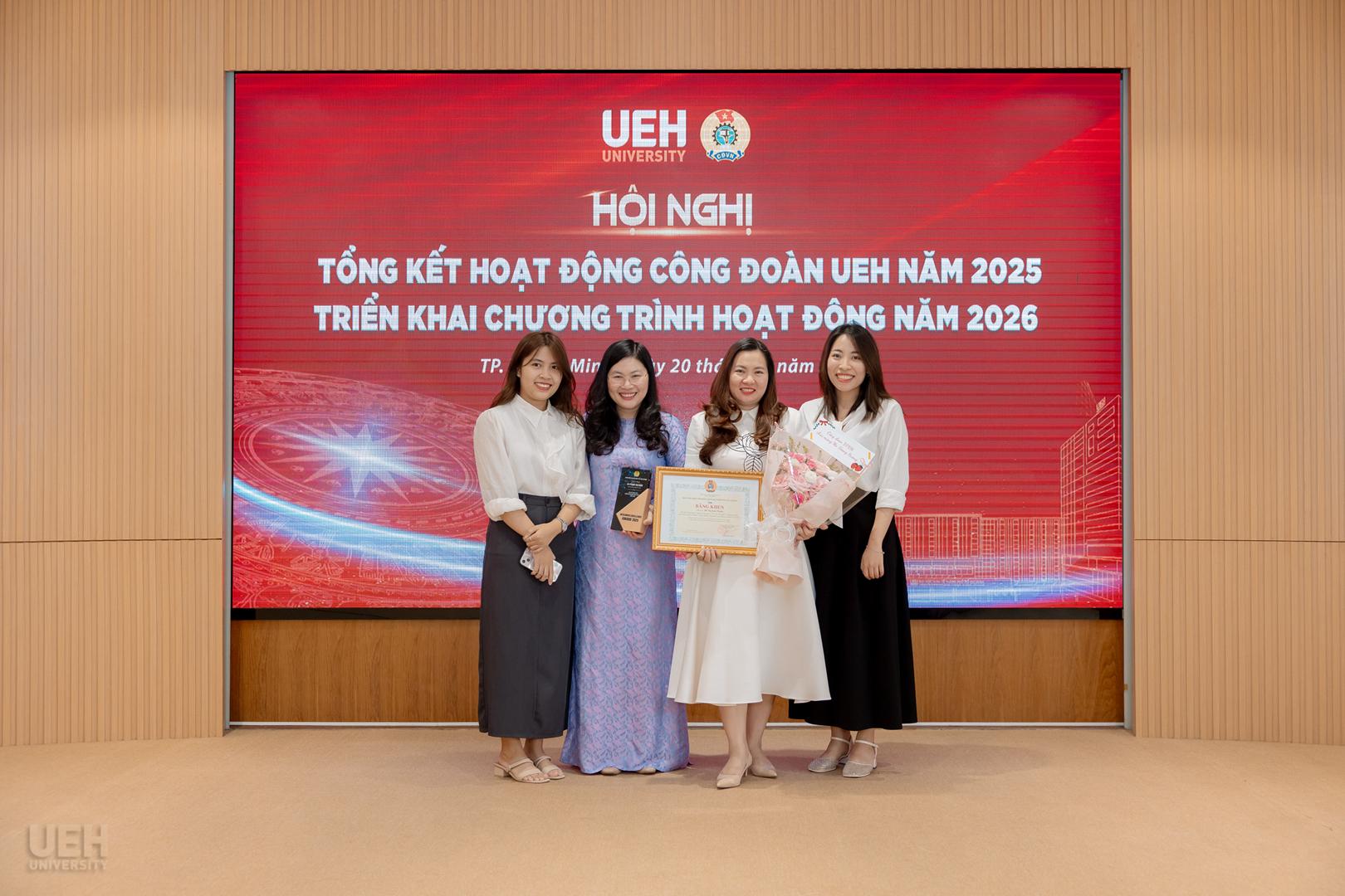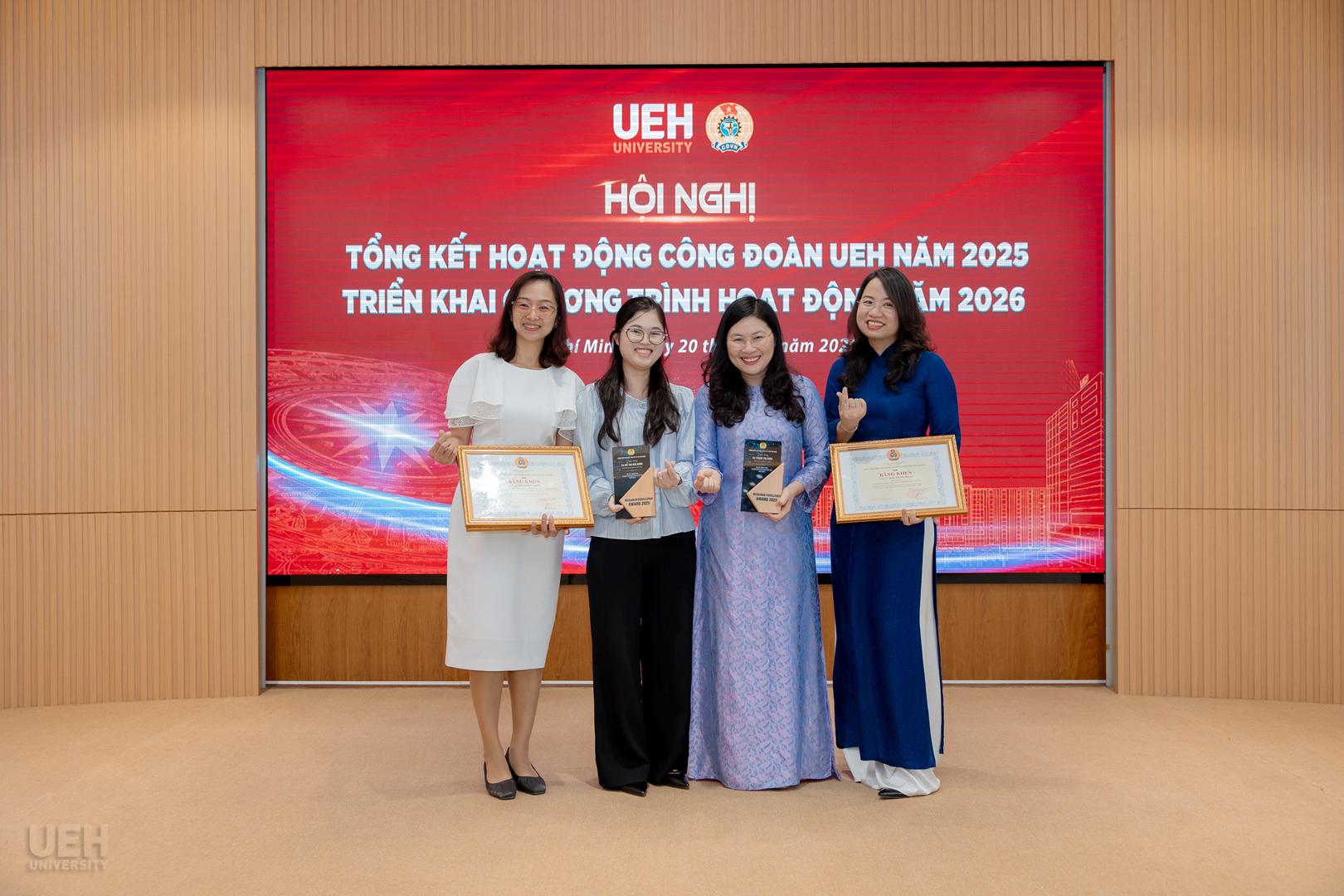 – Khen thưởng của Liên đoàn Lao động Thành phố năm học 2024 – 2025: Công đoàn UEH nhận Cờ thi đua Hoàn thành xuất sắc nhiệm vụ; 06 tập thể và 19 cá nhân tiêu biểu nhận Bằng khen đạt thành tích xuất sắc trong phong trào thi đua lao động giỏi và xây dựng tổ chức Công đoàn vững mạnh.