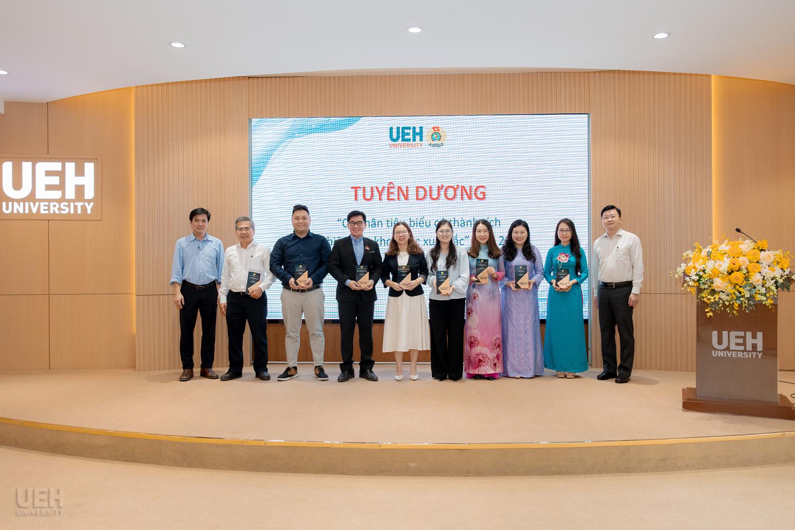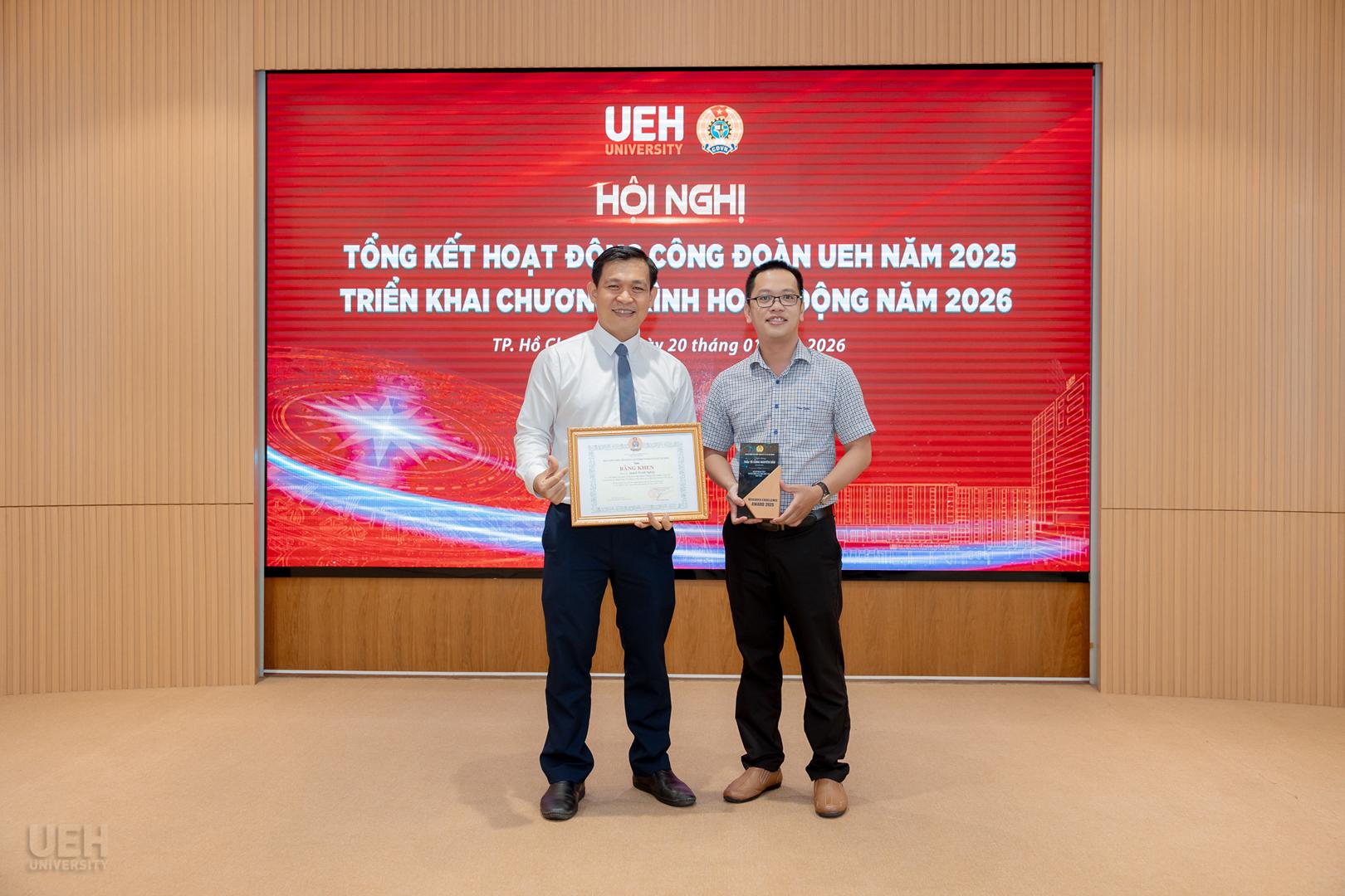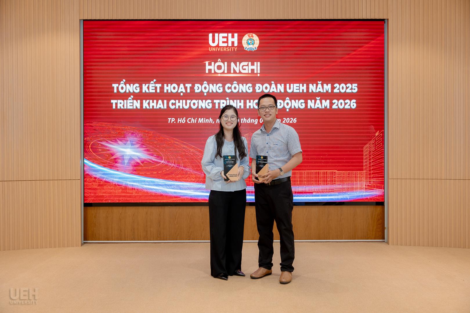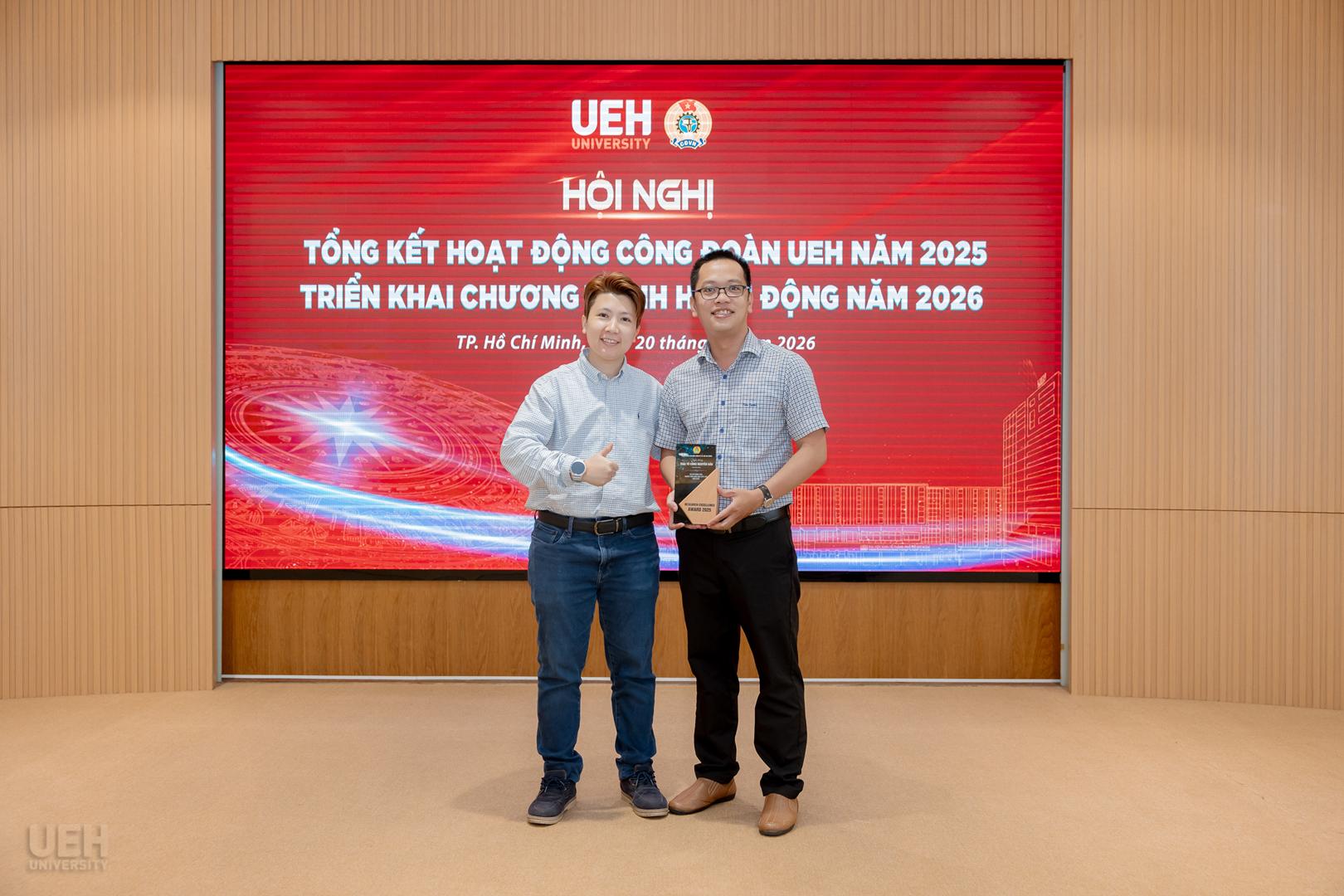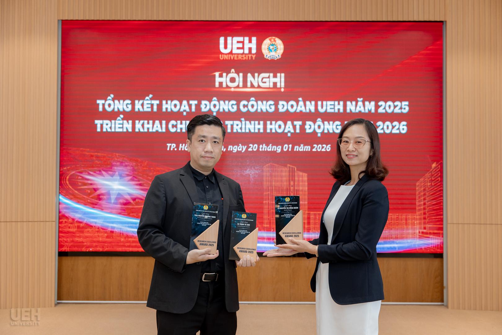 Lãnh đạo UEH và Ban Thường vụ Công đoàn UEH trao biểu trưng tuyên dương cá nhân tiêu biểu có thành tích nghiên cứu khoa học xuất sắc năm 2025
