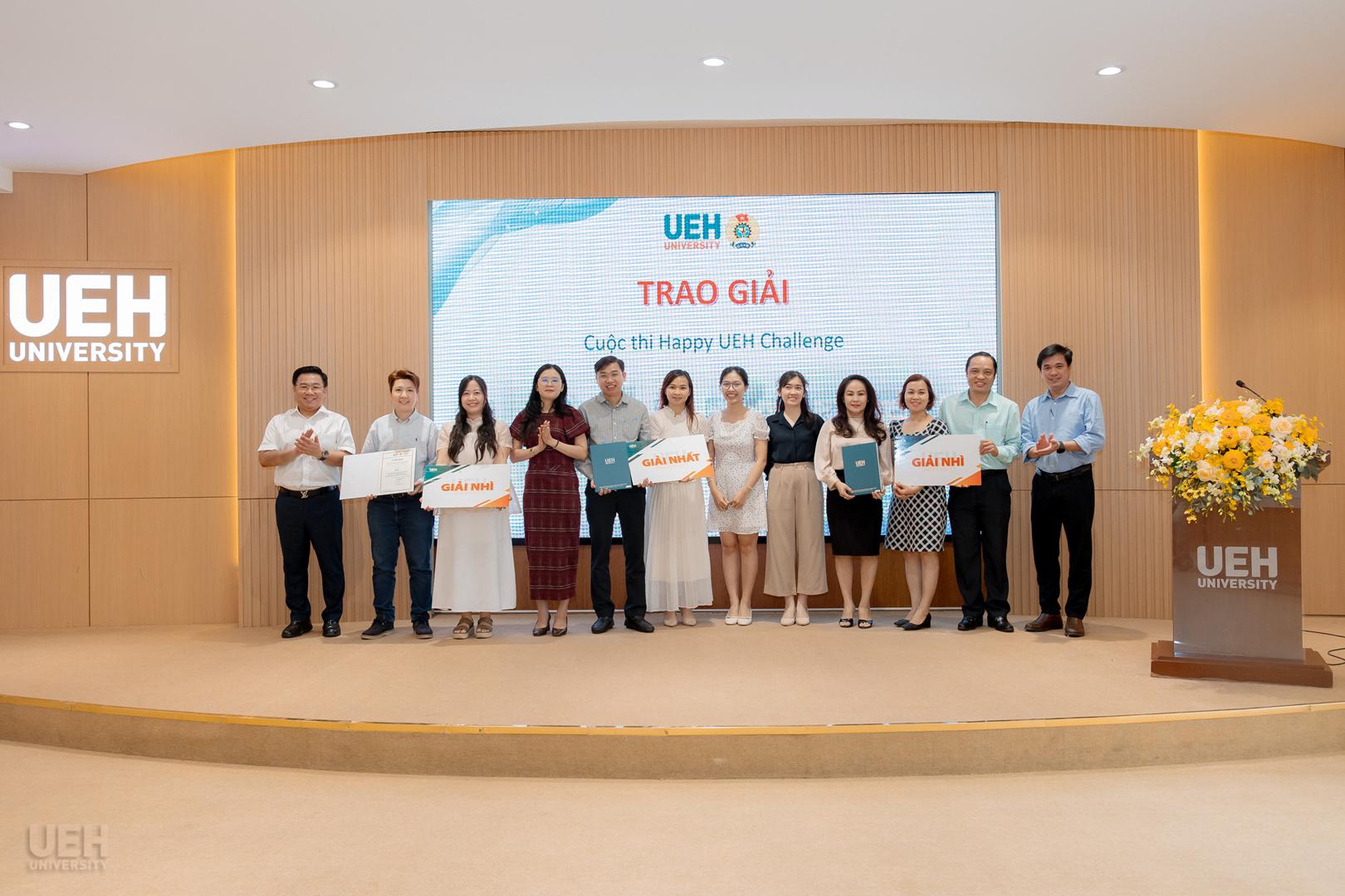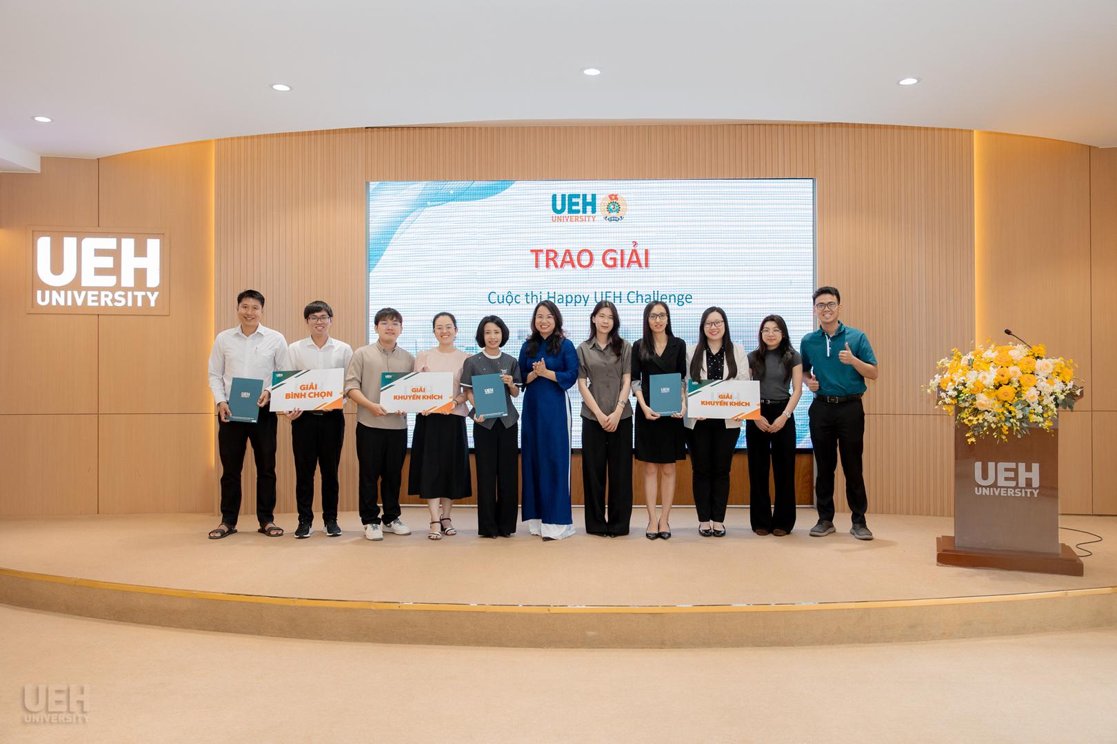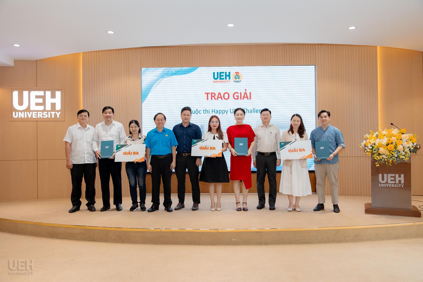 Ban Giám đốc UEH và Ban Thường vụ Công đoàn UEH trao giải thưởng cho các nhóm đạt giải Nhất, Nhì, Ba, Khuyến khích và Bình chọn cuộc thi Happy UEH Challenge