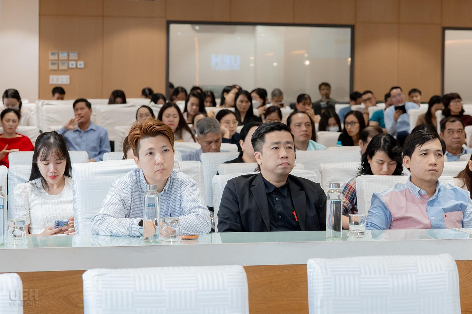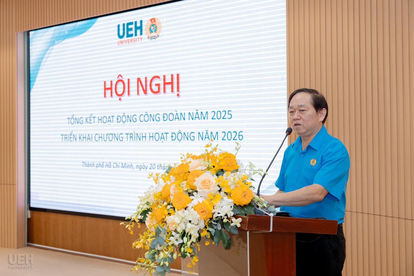 Hội nghị vinh dự đón tiếp Đ/c Lâm Ngọc Mẫn – Ủy viên Ban Chấp hành Liên đoàn Lao động Thành phố Hồ Chí Minh, Tổ phó Tổ Công tác quản lý địa bàn số 1. Về phía Đảng ủy, Ban Giám đốc UEH có sự hiện diện của GS.TS. Nguyễn Khắc Quốc Bảo – Bí thư Đảng ủy; PGS.TS. Bùi Quang Hùng – Phó Bí thư Đảng ủy, Phó Giám đốc phụ trách UEH; TS. Đinh Công Khải – Phó Giám đốc UEH. Về phía Công đoàn UEH có TS. Nguyễn Thiện Duy – Chủ tịch Công đoàn; TS. Phan Thị Bảo Quyên – Phó Chủ tịch Công đoàn; ThS. Phan Thị Thu Hằng – Ủy viên Thường vụ Công đoàn UEH, cùng các đồng chí trong Ban Chấp hành, Ủy ban Kiểm tra và hơn 100 cán bộ công đoàn, đoàn viên tiêu biểu.