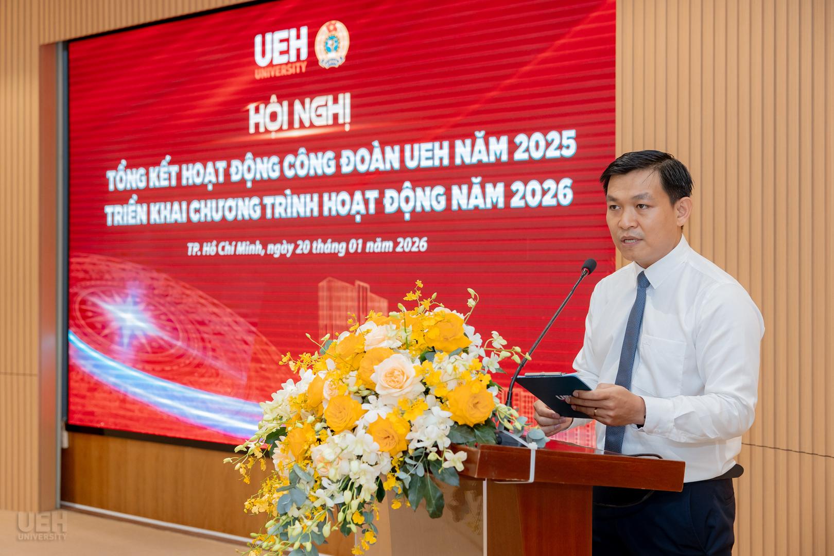 Tại Hội nghị, TS. Nguyễn Thiện Duy – Chủ tịch Công đoàn UEH đã trình bày báo cáo tổng kết năm 2025 tập trung vào những kết quả nổi bật ở các nội dung trọng tâm, gắn với chiến lược phát triển của Nhà trường. Năm 2025 ghi nhận những bước tiến toàn diện của Công đoàn UEH với tinh thần đổi mới, lấy con người làm trung tâm và chuyên nghiệp hóa trong mọi hoạt động. Điểm nhấn nổi bật trong năm qua là việc triển khai thành công chuỗi hoạt động “Tăng cường văn hóa sáng tạo vì một đại học hạnh phúc” với tâm điểm là cuộc thi “Happy UEH Challenge 2025”, ứng dụng tư duy thiết kế để khơi nguồn các sáng kiến xây dựng môi trường làm việc hạnh phúc.