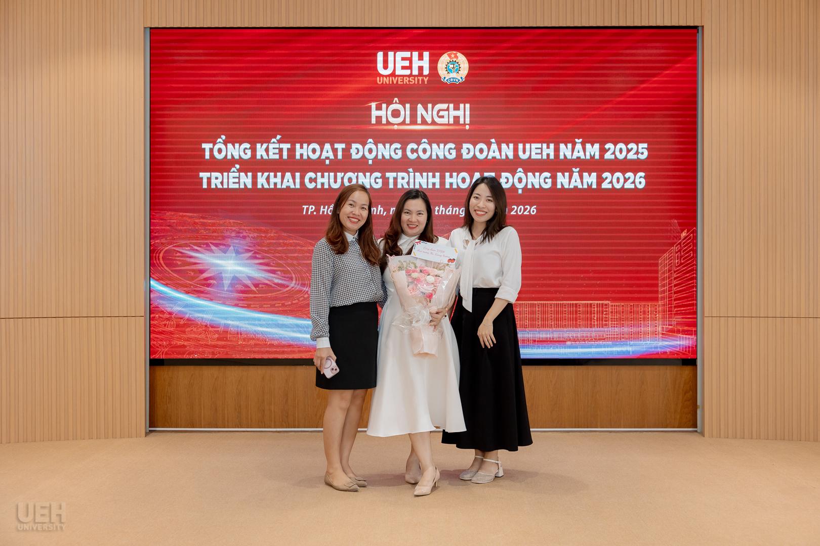Bên cạnh đó, các sự kiện kết nối quy mô lớn như “UEH Day” tại Nha Trang thu hút gần 900 VCNLĐ tham gia đã góp phần củng cố nền tảng văn hóa “ONE UEH”. Hoạt động chăm lo đời sống và trách nhiệm xã hội tiếp tục là điểm sáng với tổng kinh phí chăm lo Tết Nguyên đán lên đến 547 triệu đồng cùng hàng ngàn phần quà ý nghĩa gửi đến các thế hệ VCNLĐ. Tinh thần tương thân tương ái của cộng đồng UEHer được lan tỏa mạnh mẽ qua việc vận động hơn 500 triệu đồng cứu trợ thiên tai, bão lũ, tham gia cùng Công đoàn Giáo dục Việt Nam đóng góp xây dựng nhà công vụ cho giáo viên tại Phú Thọ và trao tặng hệ thống đèn năng lượng mặt trời tại Đền thờ các anh hùng liệt sĩ Chiến khu Rừng Sác.